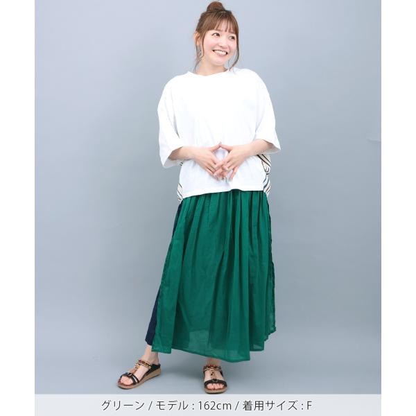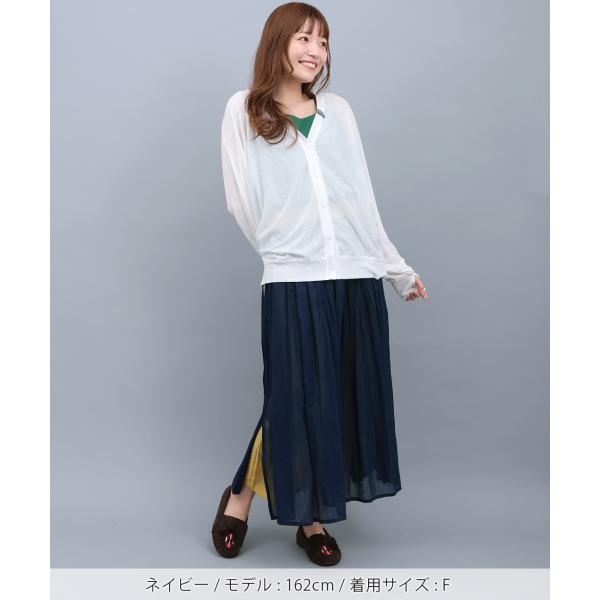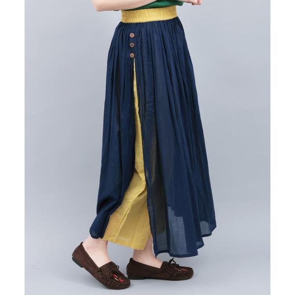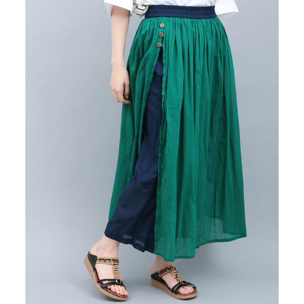 バイカラーパンツスカート / ロングパンツ レディース 春 夏 薄手 スカート見え レイヤード風 サイドボタン ウエストゴム 楽ちん ボトムス 無地 エアリー