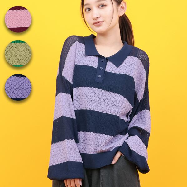 Orale! 透かし編みボーダーニットプルオーバー / ラガーシャツ風 サマーニット 透かし編み 透け感 ボーダー カラフル ショート丈 春 夏 秋 長袖 襟付き