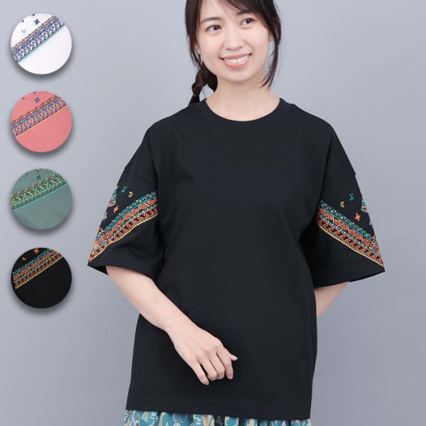 バンダナスリーブ刺繍Tシャツ / Tシャツ 吸水速乾 レディース 五分袖 半袖 ドロップショルダー オーバーサイズ 袖刺しゅう エスニック チチカカ TITICACA
