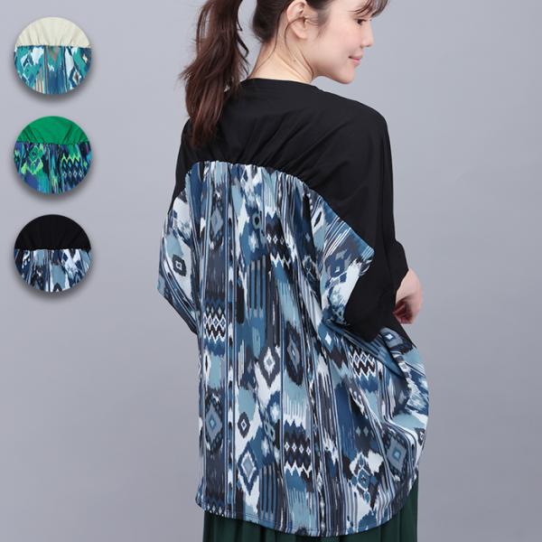 バックギャザードルマンプルオーバー / Tシャツ カットソー 異素材切り替え イカット エスニック柄 春 夏 半端袖 バックスタイル バックロング