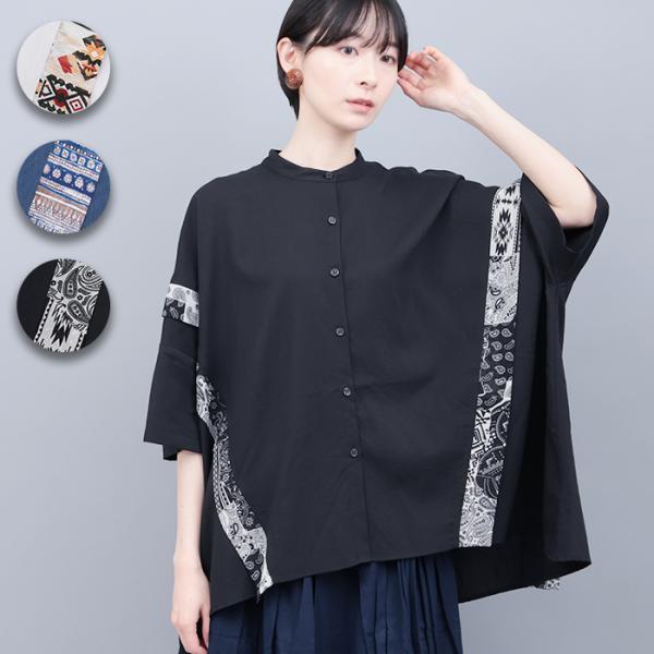 柄ライン切替シャツ / シャツ トップス 羽織り レディース 半袖 春 夏 秋 ドルマンスリーブ シンプル 無地 バックロング オーバーサイズ ゆったり