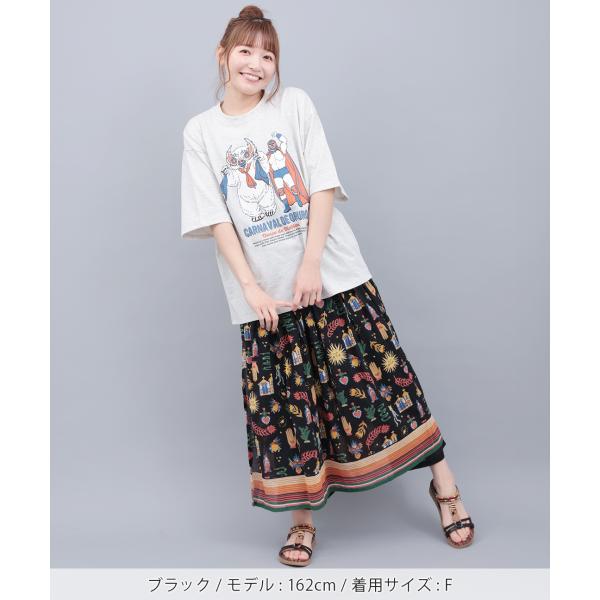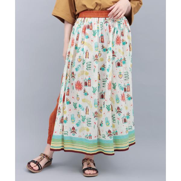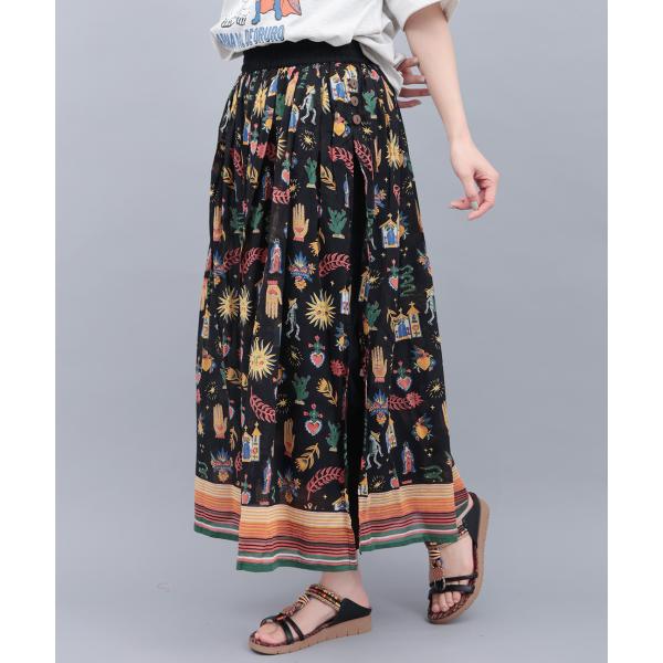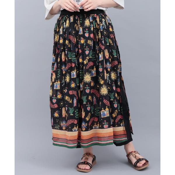 メヒコモチーフプリントパンツスカート / ロングパンツ レディース 春 夏 薄手 スカート見え レイヤード風 サイドボタン ウエストゴム 楽ちん ボトムス
