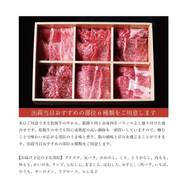 本日ご用意できる松阪牛の中から、霜降り肉と赤身肉をバランスよく盛り付けた盛合せです。松阪牛の中でも特に成熟度の高い個体を一頭買いしていますので、噛むことで味わいが広がる部位のうま味と香り、脂の風味と甘みを感じることができます。出荷当日おすすめの部位6種類をご用意します。 【お届け予定の主な部位】ブリスケ、友バラ、かめのこ、くり、とうがらし、内もも、外もも、かいのみ、ランプ、らむしん、まるしん、はねした、みすじ、三角バラ、いちぼ、ひうち、サーロイン、リブロース、ヒレなど