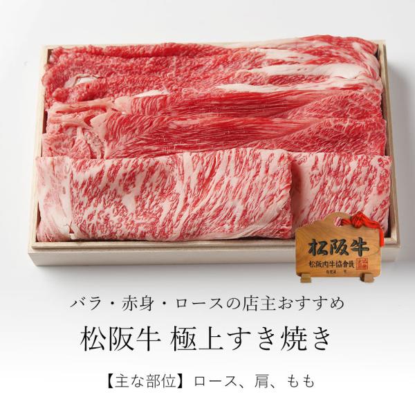 枝肉の状態で熟成する枝肉熟成をした松阪肉をすき焼き用にスライスします。きめ細やかなサーロインや肉のうま味と脂身の甘みが強い肩ロースとバランスの取れた赤身肉、霜降りのバラ肉などをバランスよく混ぜ合わせました。【お届け予定の主な部位】ロース、かた、もも、バラ