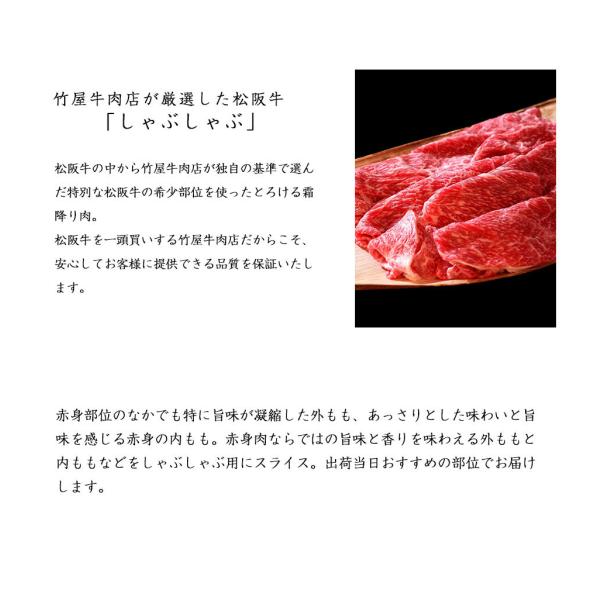 名称 松阪牛 しゃぶしゃぶ 740g産地 三重県内容量 740g消費期限 発送日より(冷蔵3日/冷凍30日)保存方法 冷蔵の場合…4℃以下で保存冷凍の場合…-18℃以下で保存加工業者 竹屋牛肉店 三重県津市高茶屋小森町水谷344備考 冷凍便でお届け致します。