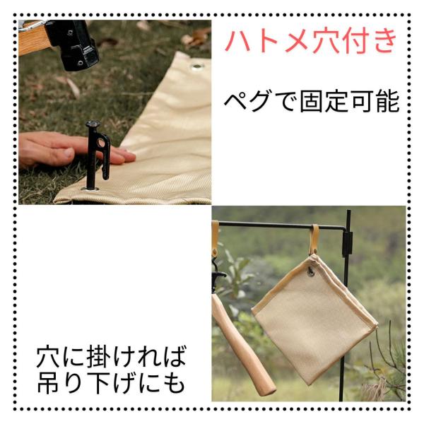 4つ角にハトメ付きの穴が空いているので、ペグでしっかり固定できます。