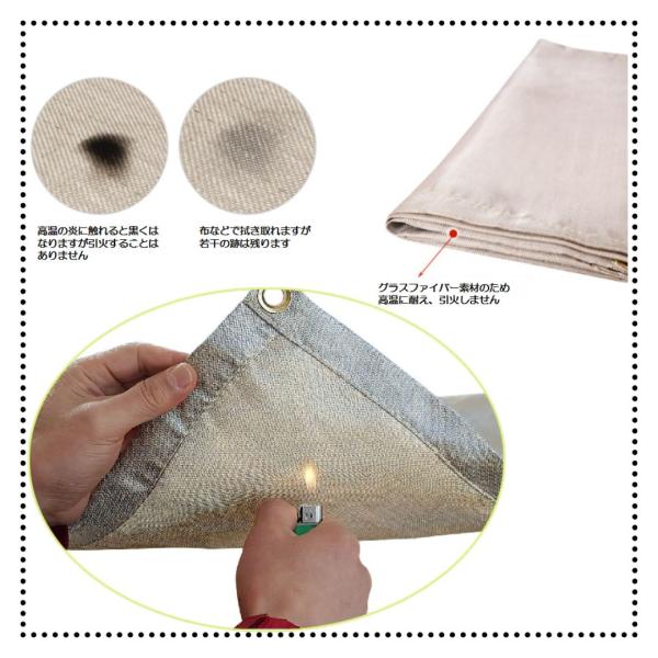地面へ伝わる「放射熱」を遮り「火の粉」や「燃えかす」がこぼれた時にそれを受け止め地面を保護する耐熱温度550度のガラス繊維を使用しています。