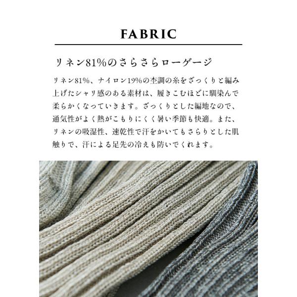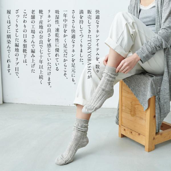 このさらさら感、履くほどに、どんどん好きになる。快適なリネンアイテムを数々販売してきたTOKYO BASICが満を持してつくりました。さらさら快適なリネンを足元にも。一年中汗をかく足元だからこそ、吸湿性、速乾性に優れているリネンの良さを感じていただけます。靴下産地の奈良で七十年以上続く老舗の工場さんが編み上げたこだわりの日本製靴下は、ざっくりとした編地のリブ目で、履くほどに馴染んでくれます。tokyobasic TOKYO BASIC 東京ベーシック