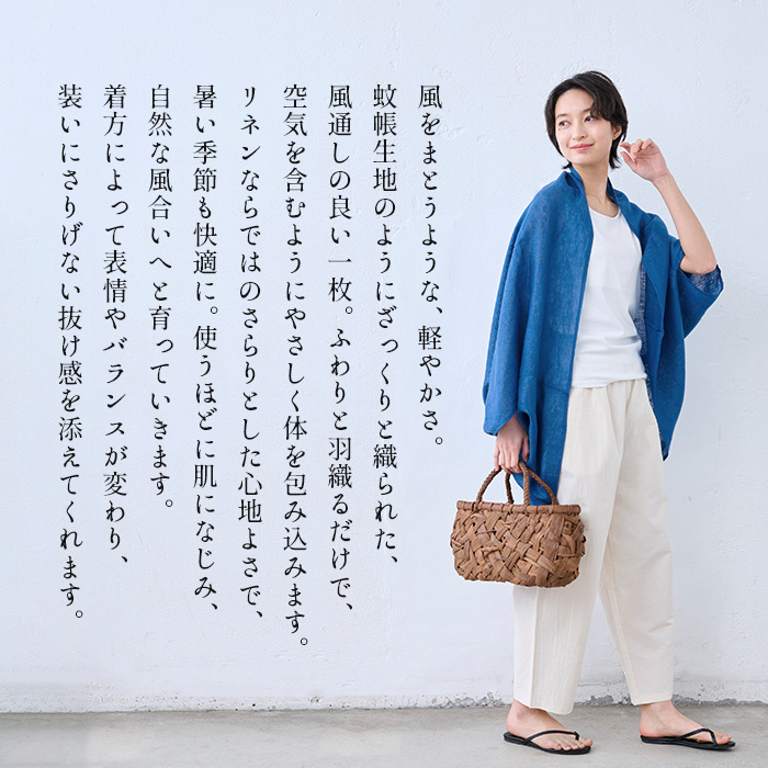 フレンチリネン100% リネンガーゼ カーディガン レディース 日本製 夏 羽織り 薄手 涼しい 軽い ゆったり。蚊帳生地のようなざっくり織りで通気性が良く、夏でも涼しい着心地。ポンチョ風 シルエット ゆったり 体型カバー ドルマン風 軽やか ナチュラル。冷房対策 日よけ UV対策にもおすすめ。吸水 速乾でさらっと快適。パンツ スカート ワンピースに合うリネンカーディガン。