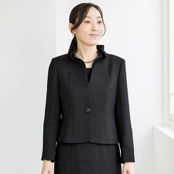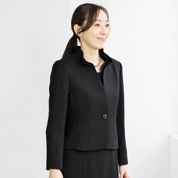 ブラックフォーマル 喪服 礼服 婦人スーツ 黒 漆黒 濃染加工 フォーマル レディース 女性 婦人服 アンサンブル セットアップ ジャケット ワンピース スタンドカラー 立ち襟 首周りカバー フリル襟 1つボタン 釦 勝山織 織地 体型カバー ツーピース風 スーツ風 ジャケット風 ワンピース 七分袖ワンピース 前開き 前ファスナー フロントファスナー ポリエステル キュプラ裏地 東京ソワール トウキョウソワール tokyosoir ブランド ソワールベニール 大型量販店取扱い 上品 上質 高級感 葬式 葬儀 通夜 告別式 弔問 弔事 法事 法要 お墓参り お別れの会 お盆 式典 冠婚葬祭 卒園式 卒業式 先生 親族 喪主 参列者 シンプル 定番 スタンダード おしゃれ デザイン 小柄 低身長 着丈短め ミセスゆったり 30代 40代 50代 60代 70代 通年 オールシーズン 春夏秋冬 サイズ展開豊富 小さいサイズ 大きいサイズ 7号 9号 11号 13号 15号 17号 19号 21号 SS S M L LL 2L XL 3L