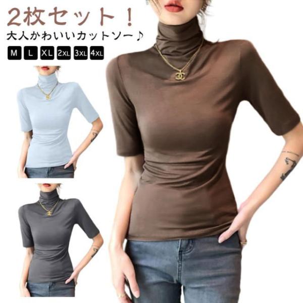 タートルネック 半袖Tシャツ トップス ハイネック カットソー 2枚セット 涼感 接触冷感 冷感 涼しい 送料無料 レディース 春 夏 無地 ゆったり