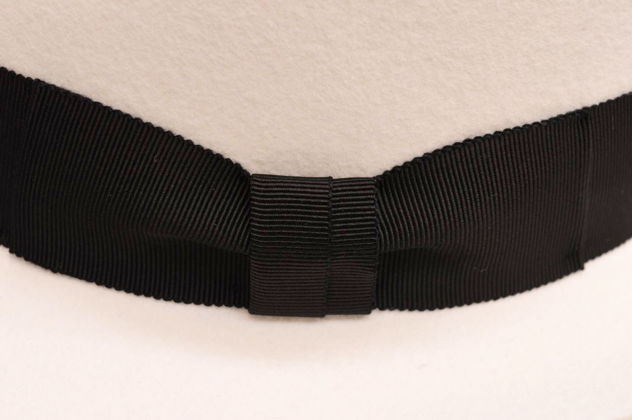 オフホワイト色の本体色にブラックのグログランリボンによるシンプルでいて定番の中折れ帽子としてフォーマルからカジュアルまで幅広い範囲でのご着用がいただけます。
