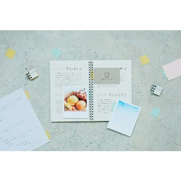 持ちたい紙をパーツの粘着面に貼りつけ、パーツの3つのリング穴をノートのリング部分にはめるだけで、かんたんにセット完了。