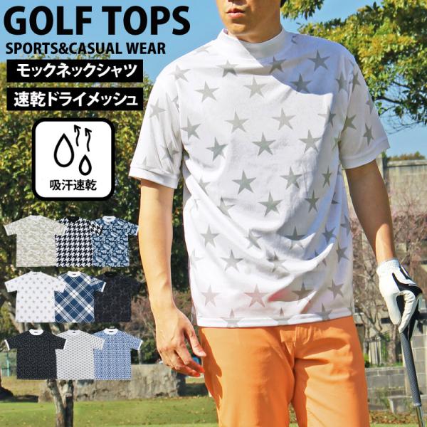ゴルフウェア モックネック メンズ 速乾ドライメッシュ 半袖 ポロシャツ 春夏 カモフラ迷彩 総柄 千鳥格子 チェック 星スター ボタニカル トップス