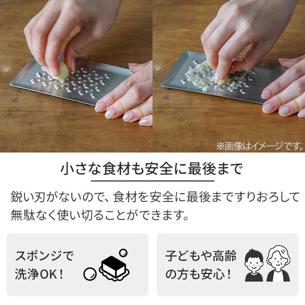 にんにくのような小さな食材も最後まで安全におろすことができます。サイズも卓上で使用するのに最適なので、わさびやしょうが、薬味等をその場でおろすことができます。