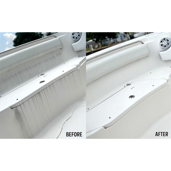 ファイバーグラス、金属、プラスチック、ゴム、ビニールや塗装面など船体についた水による黒い縞を素早く除去します。