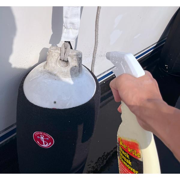 船体に残る黒い水垂れの筋(ブラックストリーク)、排気などによる広範囲の黒ずみなど、落ちにくい黒い汚れを落とすための洗剤です。