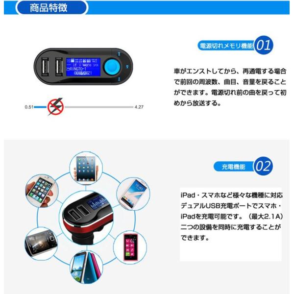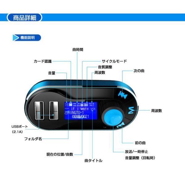 FMトランスミッター Bluetooth 車載MP3プレーヤー ワイヤレス 高速液晶 小型軽量 音楽再生 iPhone iPad USB 対応