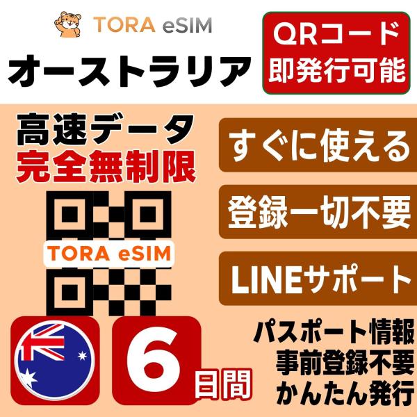 オーストラリア eSIM | 6日間 | 無制限 | 最短15分QRコード自動発行(24時間) | 高速データ 5G/4G SIM 即日発行 テザリング可 日本で事前設定OK LINEサポート
