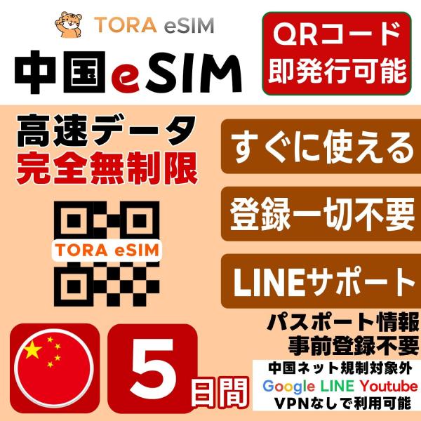 中国 eSIM | 5日間 | 無制限 | 最短15分QRコード自動発行(24時間) 即日発行 | 日本で設定OK | 中国ネット規制対象外 Google LINE YouTube VPN なしで利用可 SIM