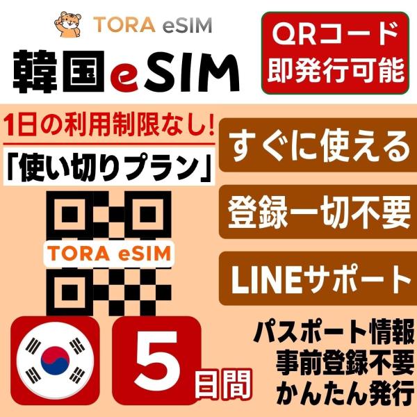 韓国 eSIM | 5日間 | 無制限 | 最短15分QRコード自動発行(24時間) | 高速データ SIM 5G/4G 即日発行 テザリング可 日本で事前設定OK LINEサポート