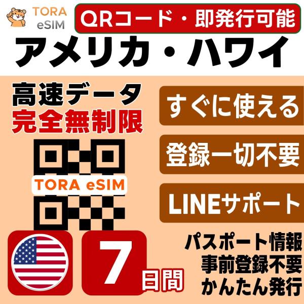 アメリカ 本土 ハワイ eSIM | 7日間 | 無制限 | 最短15分QRコード自動発行(24時間) | 高速データ SIM 5G/4G 即日発行 テザリング可 日本で設定OK LINEサポート