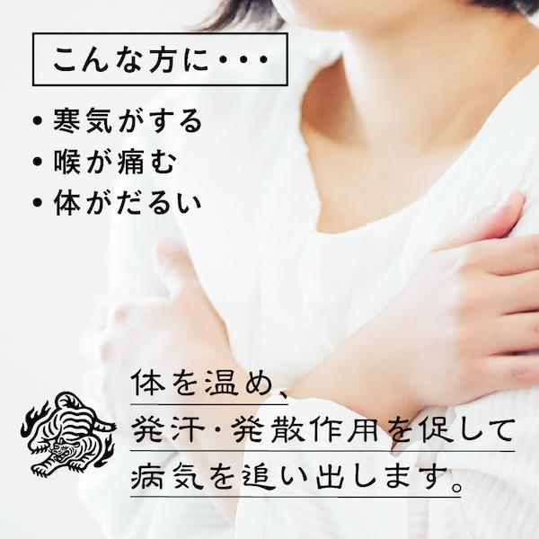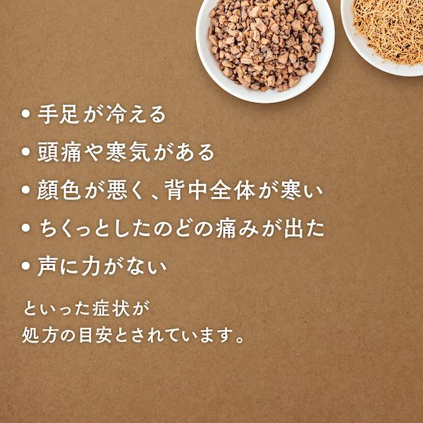 手足の冷えや頭痛、寒けのほか、鼻水や水っぽい痰などの症状のある人に適しています。ふだんから体が弱い人や、高齢で虚弱な人のかぜの改善によく用いられています。