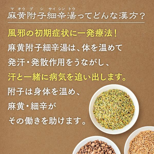 麻黄附子細辛湯(マオウブシサイシントウ)は、体を温めて発汗・発散作用をうながす働きのある漢方薬です。特に微熱を伴うかぜの初期に起こる症状の改善に有効です。