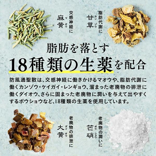 脂肪を落とす18種類の生薬を配合。 交感神経に働きかけるマオウや、脂肪代謝に働くカンゾウ・ケイガイ・レンギョウ、溜まった老廃物の排泄に働くダイオウ、さらに固まった老廃物に潤いを与えて出しやすくするボウショウなど。