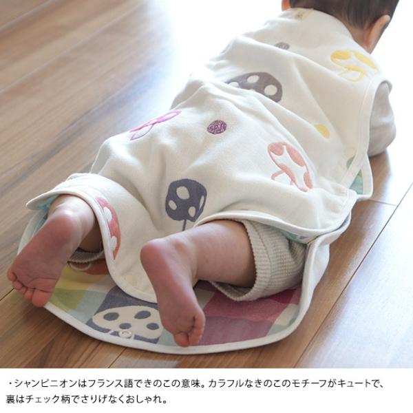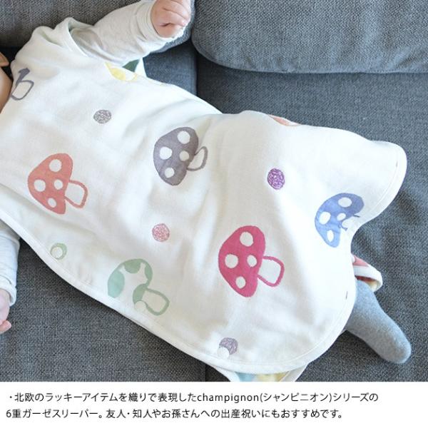 [特徴]:北欧のラッキーアイテムを織りで表現したchampignon(シャンピニオン)シリーズの6重ガーゼスリーパー。カラフルなきのこのモチーフがキュートで、裏はチェック柄でさりげなくおしゃれ。