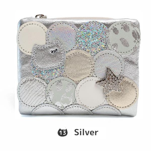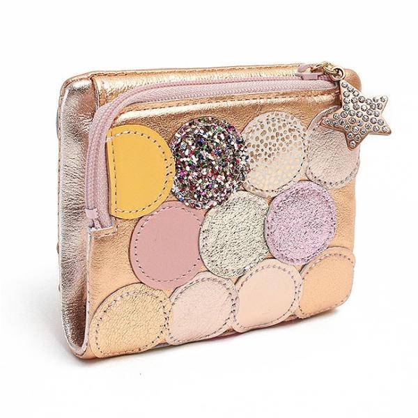 シリーズ案内:ツモリチサト新マルチドット ミニ財布 tsumori chisato CARRYツモリチサトの定番・人気の新マルチドットシリーズです。エナメル、ドットプリントなどさまざま素材の革を丸く型どり、パッチワークした二つ折り財布。内装には、カードポケットが6カ所に、札入れが1カ所。小銭入れは背面に備え付けられているので、コインの出し入れもスムーズです。華やかでキラキラな、とびきり可愛らしいデザインです。
