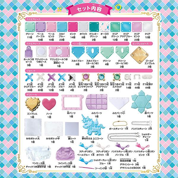 ピース173個、中袋2個、バッグチャーム1個、ボールチェーン1本、ハンドルチェーン2本、ステッチリボン2本、ソーイング針1本、ジョイント257個、デコシール2個、枠パーツ1個、ふたパーツ1個、ふたパーツ小1個、底パーツ1個、みせポケット大1個、みせポケット中1個、鏡シート1枚、バッグチャーム1個、ショルダーチェーン1本、デザインシート1枚、取扱説明書1枚