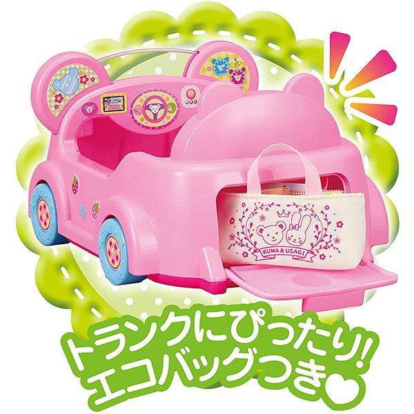くまさんデザインのかわいい車で、メルちゃんを乗せて手転がしで遊ぶことができます。