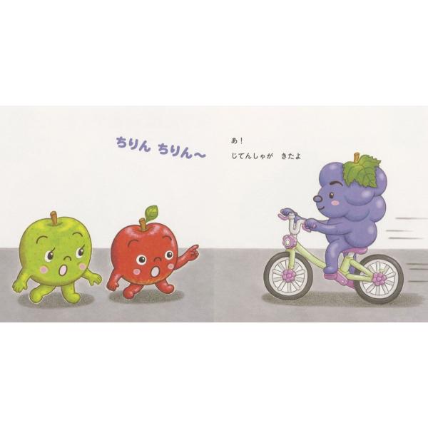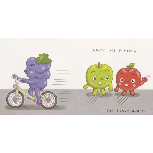 りんごくんとあおりんごちゃんが、くだもの公園までおさんぽします。「じてんしゃが きたよ」「はしっこに いくと ぶつからないよ」「くるまが きたよ」「てをつなごうね」「あかはとまれ あおになったらわたろうね」……かわいいくだものたちが、交通ルールを優しく伝えます。子どものおさんぽには、心配がつきもの。幼児クラスからでも読める、待望の交通安全絵本です。