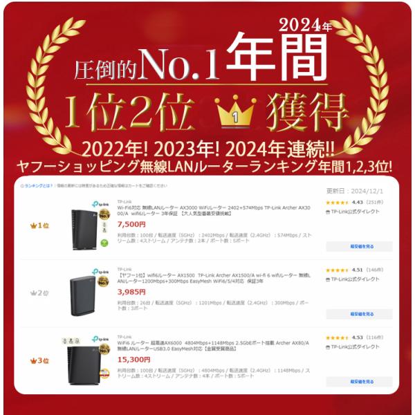 ヤフー年間1位★ Wi-Fi6 ルーター 無線LANルーター AX3000 WiFiルーター 2402+574Mbps TP-Link Archer AX3000/A 3年保証【大人気型番最安値挑戦】
