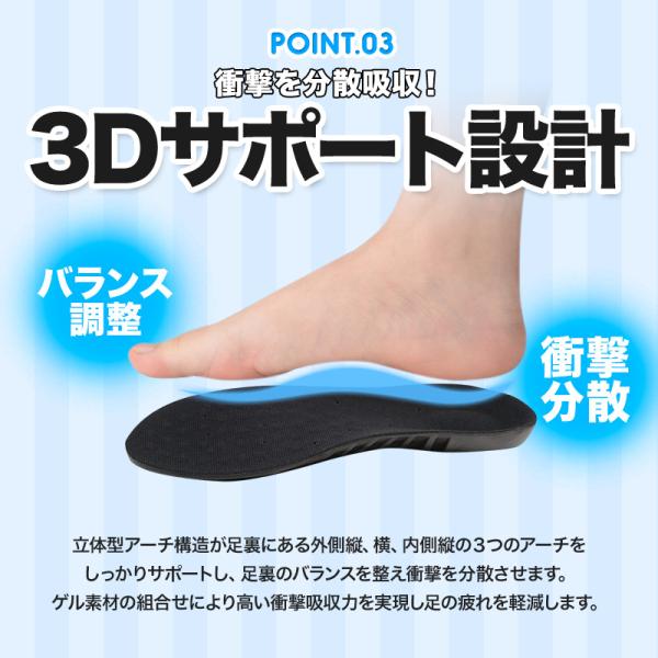 立体型アーチ構造が足裏のバランスを整え衝撃を分散し、ゲル素材によって高い衝撃吸収力を実現