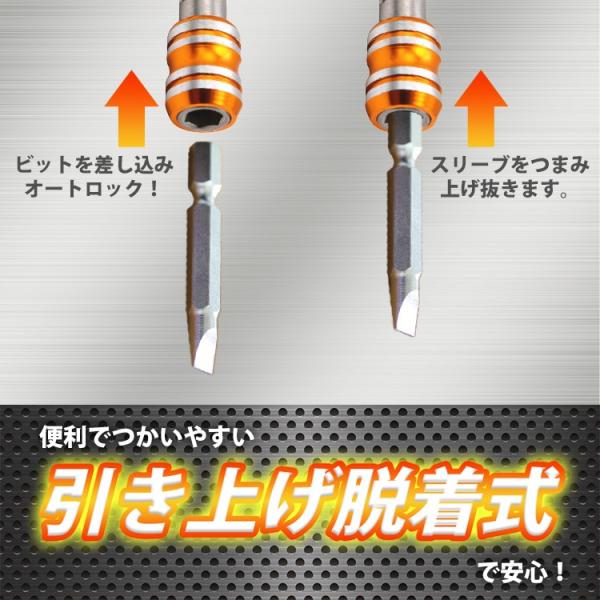 ホルダーにビットを差込めば自動でロックされ、ホルダーから外す際はスリーブを引上げる事