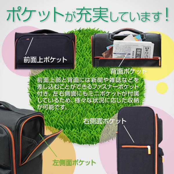 ・前面と背面、両側面にはファスナーポケット付きで、新聞や雑誌などを差し込むことが可能になっています。