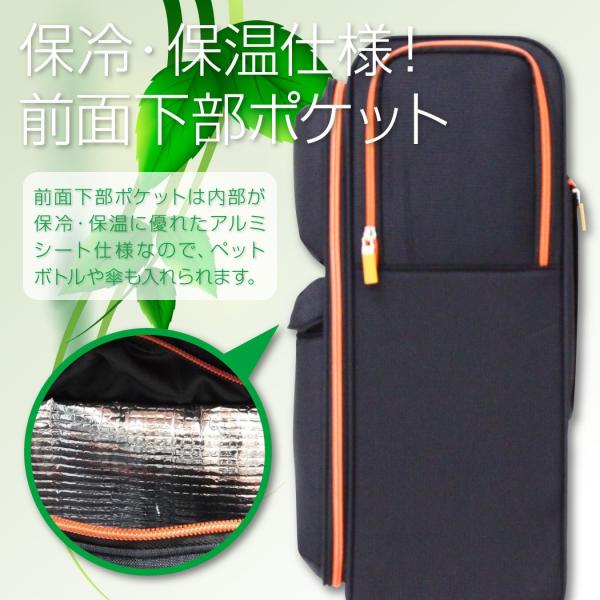 ・前面下部ポケットは内部が保冷・保温に優れたアルミシート仕様なので、ペットボトルや傘も入れられます