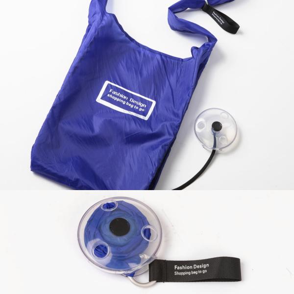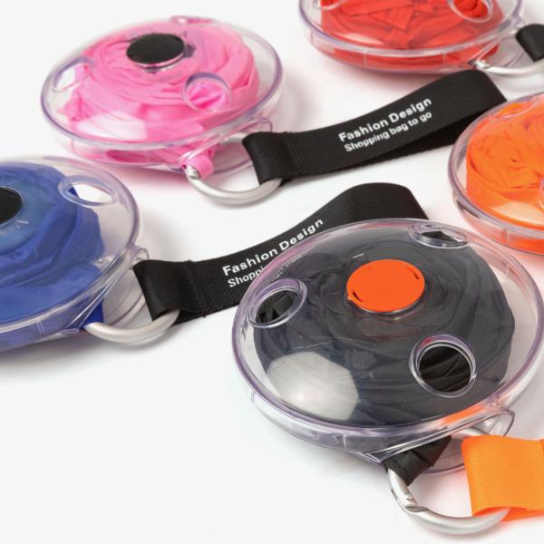 ・丸い透明ケースに巻き取り収納できるコンパクトなロールアップ式エコバッグです。