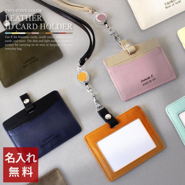 名入れ 2色使い本革IDケース おしゃれ ネックストラップ 本革 横型 リール付き メンズ レディース