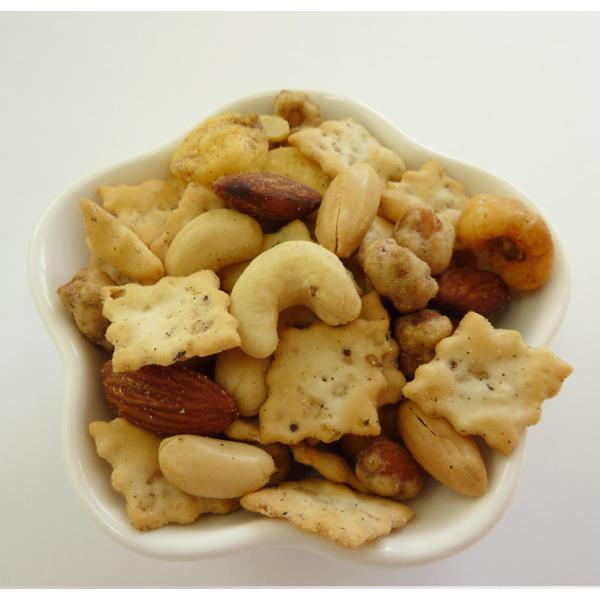 配合内容:ペッパージャイアントコーン(ペルー産)、ペッパーセサミ、マヨネーズピーナッツ(中国)、塩アーモンド(アメリカ産)、塩カシューナッツ(インド産)バターピーナッツ(中国)