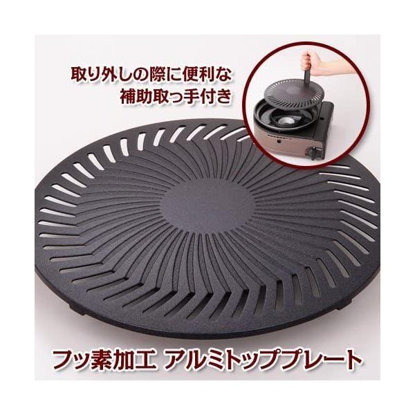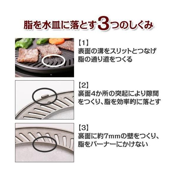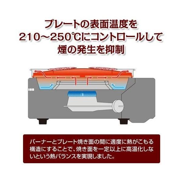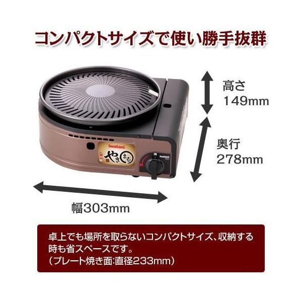 本体サイズ:幅303×奥行278×高さ149mm/プレート外径:233mm/商品重量:約2.0kg/カラー:ブロンズ&ブラック/材質:[本体] 鋼板、[プレート] アルミダイカスト、[水皿] 鋼板、[バーナー] 耐熱アルミダイカスト、[点火つまみ] ABS樹脂/最大発熱量:1.0kW (900kcal/h)/連続燃焼時間:約217分 (気温20〜25℃のとき強火連続燃焼にてカセットボンベを使い切るまでの実測値)/点火方式:圧電点火方式/安全装置:圧力感知安全装置 他/容器着脱方式:マグネット方式/使用ガス:イワタニカセットガス/生産国:日本 ※カセットガスは別売りです。