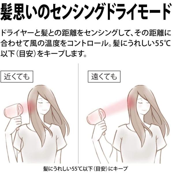 左右の吹出口から出る風で、速乾力がさらにパワーアップ。ノズルが短い新デザインだから、ヘアドライもラクラク。スマートフォンで自分好みのモードにカスタマイズできる、美髪アプリに対応。髪を思いやるセンシングドライモード。その他、ヘアケアしながら乾かせる多彩なモードがいっぱい。カラーリングの退色を抑えながら、なめらかな手ざわりのヘルシーヘアへと導くプラズマクラスター。