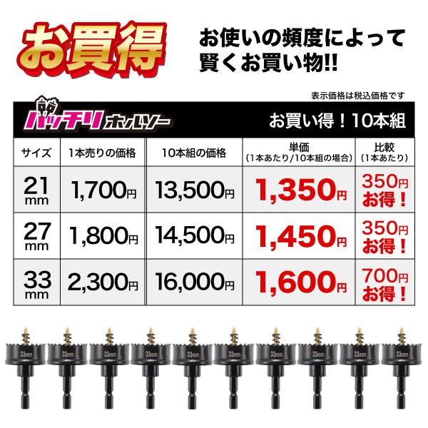 ホールソー ホールソーセット 33mm×10本 バッチリホールソー