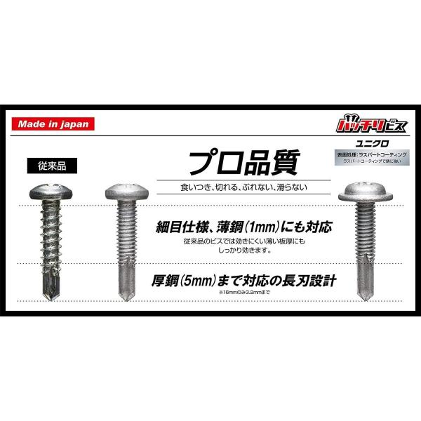 薄鋼にも対応したピッチ(ねじ山)形状に加え、5mm厚まで下穴なしの長刃設計