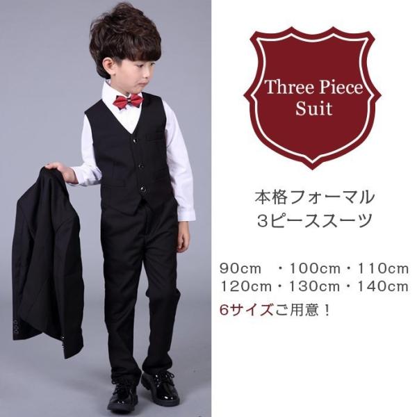 子供用本格派スリーピーススーツ。七五三や卒園式、卒業式、入学式、結婚式、パーティ、ピアノの発表会など様々なフォーマルシーンにおすすめの礼服です。スタンダードなブラックでシックにきまる。チェーンブローチや蝶ネクタイなど小物アクセサリーも豊富なので、シーンに合わせてコーディネートが楽しめます。サイズも豊富なので兄弟でお揃いコーデもかっこいい!(90cm/100cm/110cm/120cm/130cm/140cm/150cm/2歳/3歳/4歳/5歳/6歳/7歳/8歳/9歳/10歳)園児 幼稚園 保育園 年少組 年中組 年長組 小学生 低学年 高学年におすすめサイズ。 爆買