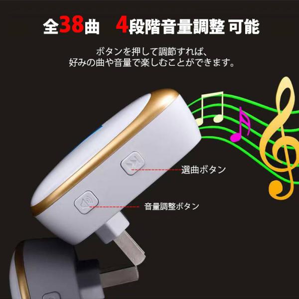 目や耳が不自由な方にも使いやすい、光と音のワイヤレスチャイムです。高感度受信機を採用し、電波到達距離は最大60mと安定性に優れています。広い住宅や介護施設でも安心して利用できます。呼び出しベルは38曲から選択でき、音量は4段階で調整可能です。