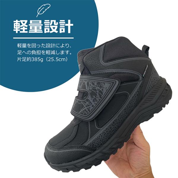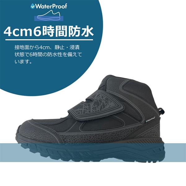秋冬シーズンをアクティブに乗り切るミッドカットモデルが新登場。グリップ力を高めるポイントスパイク意匠で、接地面から4cm、静止・浸漬状態で6時間の防水性を備えた防水設計。ゆったり履ける幅広6Eで、キングサイズ29.0cm・30.0cmまで対応。