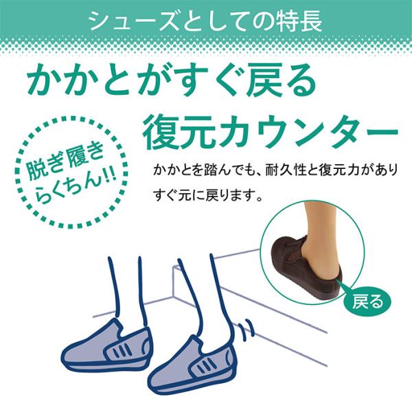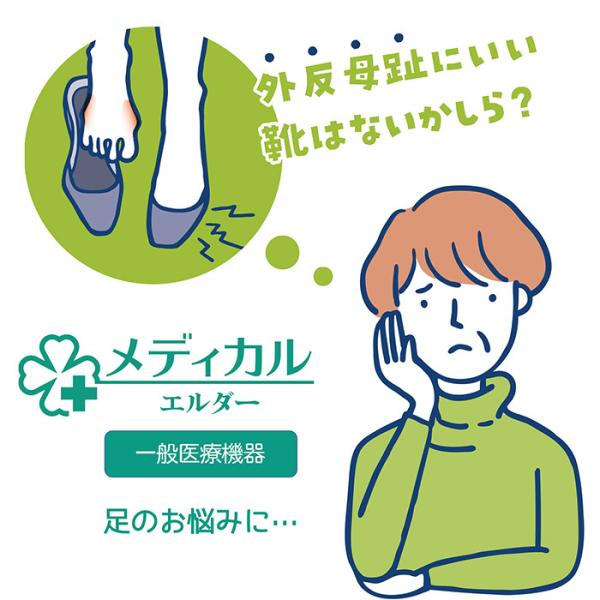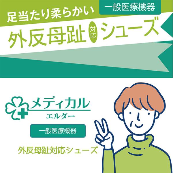 広島化成の一般医療機器シューズ「メディカルエルダー」の外反母趾対応シューズです。患部に配置した、伸びがあり足当たりの柔らかい素材が、痛みのある外反母趾を優しく包み込みます。また、シューズ自体の機能も充実。柔らかいアーチクッションが土踏まずを優しく支えるアーチサポートインソールや、脱ぎ履きがとても楽チンな かかとを踏んでもすぐ戻る復元カウンター構造を採用しています。足もと軽やか軽量設計です。あなたの足の悩みを確かな機能でサポートします。